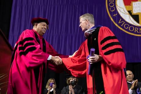Prior to the commencement address, Rougeau bestowed honorary degrees upon Dr. Verghese and Rev. Philip L. Boroughs, S.J., 32nd president of Holy Cross and Rougeau’s predecessor.